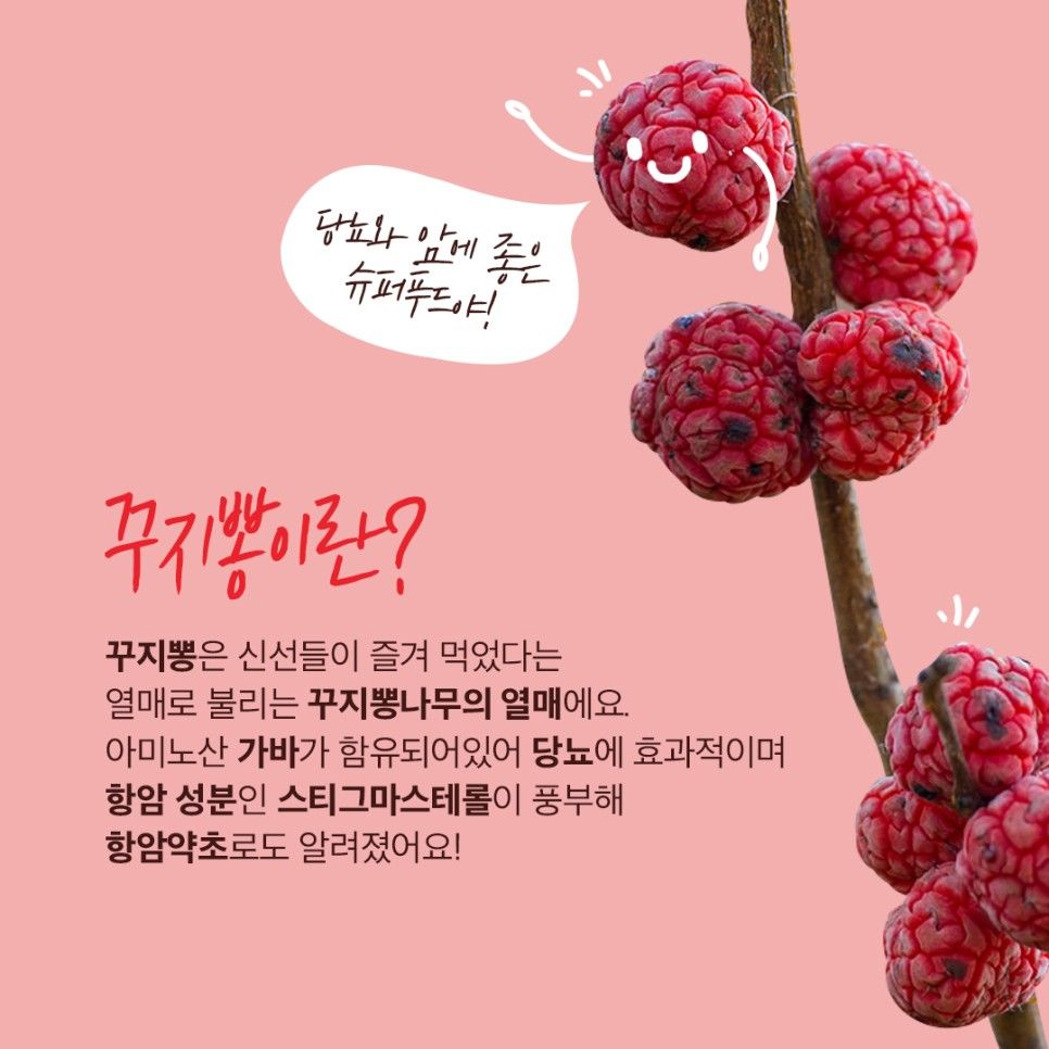 꾸지뽕에는 인슐린의 작용을 도움이 되는 내당인자가 내포되어 있어 체내 포도당의 이용률을 높이고, 인슐린의 분비를 제어하여 당뇨를 고쳐주는 효과가 있습니다. 각별히 당뇨에 좋은 효과를 나타내는 가바(GABA) 성분이 녹차의 40배 이상 포함되어 혈당을 내리고 췌장의 부담을 감소시켜주는데 효과가 좋다고.