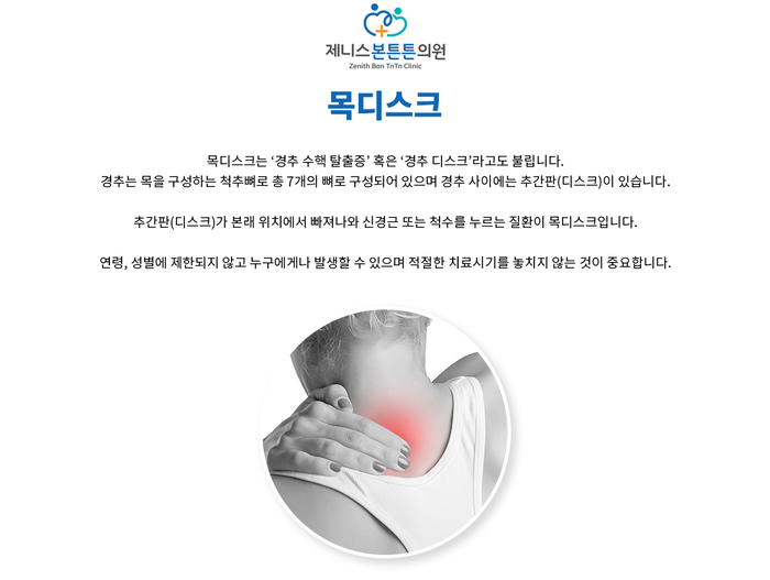 목 디스크란 경추 뼈와 뼈 사이의 추간판 ( 디스크 )이 탈출하였거나 파열돼 경추신경이 자극 또는 압박을 받아 경항부 ( 목 ), 경견부 ( 목과 어깨 ), 견배부 ( 어깨와 등 ), 상지 ( 팔 )에 통증 및 신경학적증상을 나타내는 질환 이고요. 경추는 운동성이 큰부위 이예요.