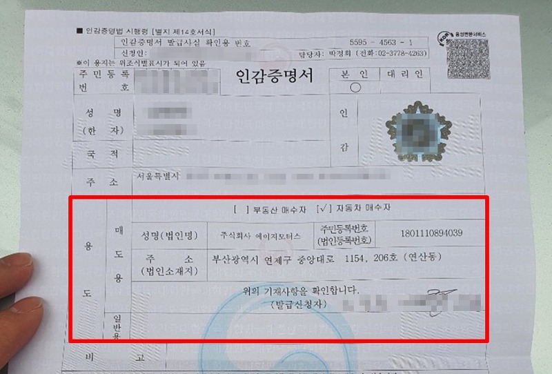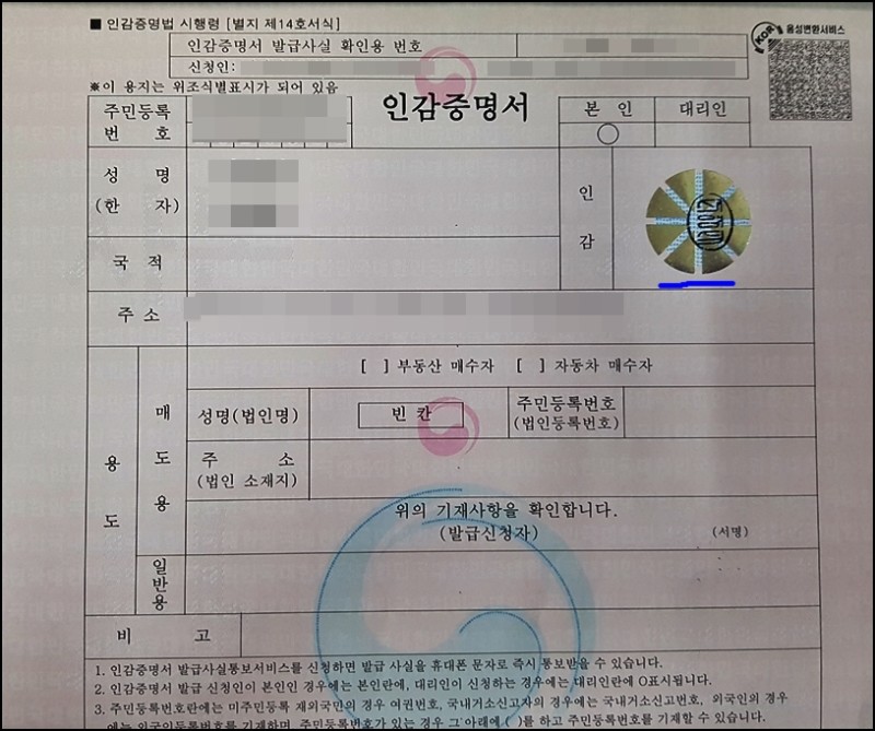 여기서 본인의 인감 등록 번호와 개인정보를 입력해야 합니다. 이 정보가 정확하게 입력되어야만 인감증명서를 발급받을 수 있습니다. 한 번 더 입력한 정보를 확인한 후, ‘발급 신청’ 버튼을 클릭하시면 됩니다.